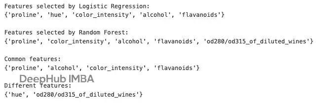 柱状图显示了各个特征在不同模型中的排名,热力图直观地展示了哪些特征被选中。可以看到 proline、flavanoids 等几个特征在两个模型中都比较重要。