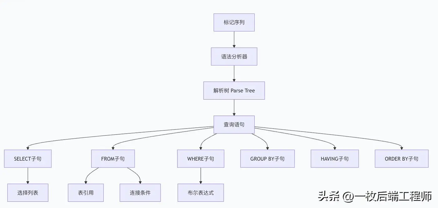 语法分析器根据MySQL的语法规则将标记序列转换为解析树(Parse Tree)。