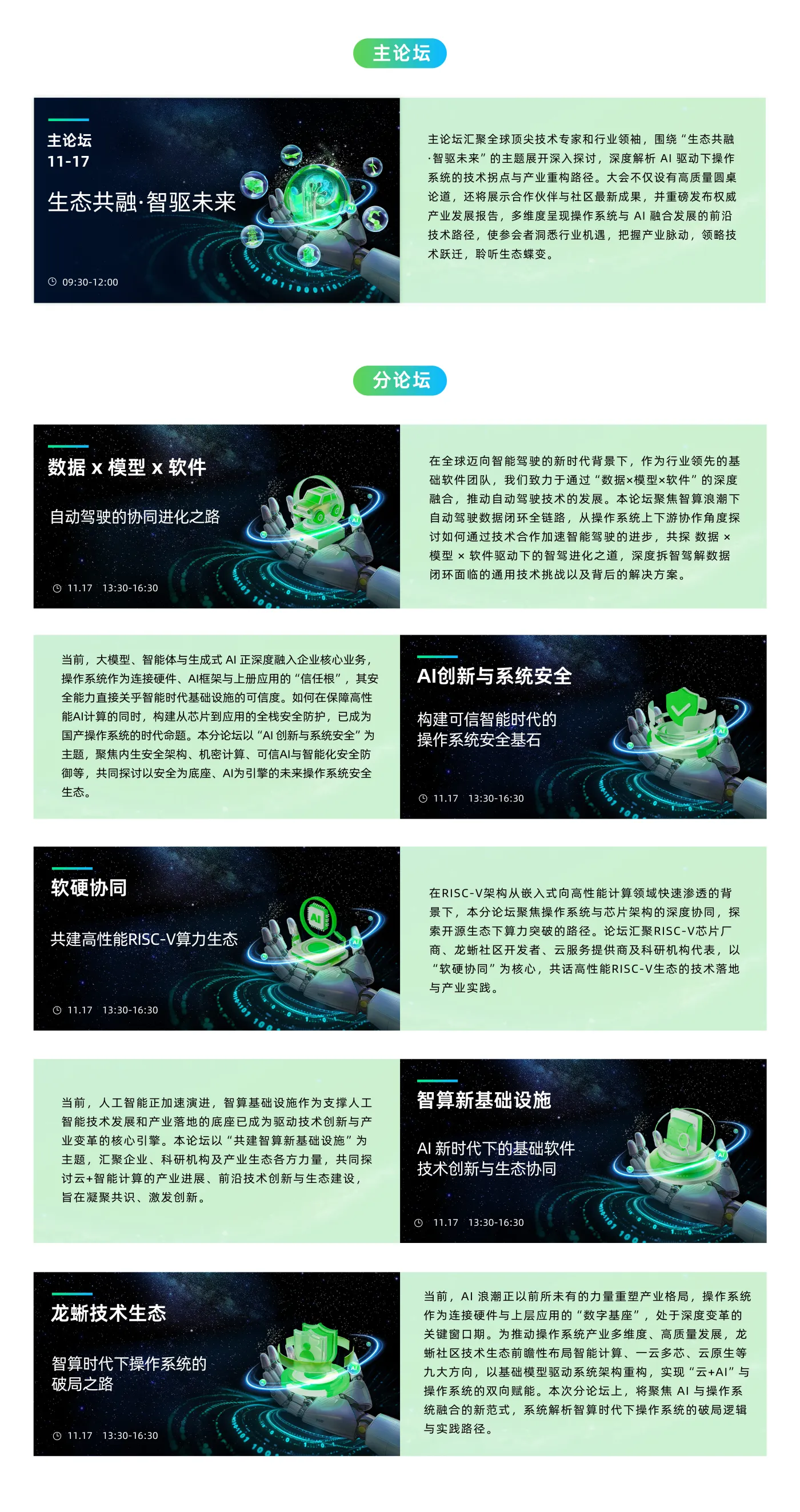 ● 前沿探索:1 个产业主论坛、5 个技术分论坛,深入探讨 AI 时代下操作系统产业发展的新趋势、新挑战与新路径。
