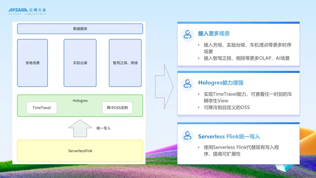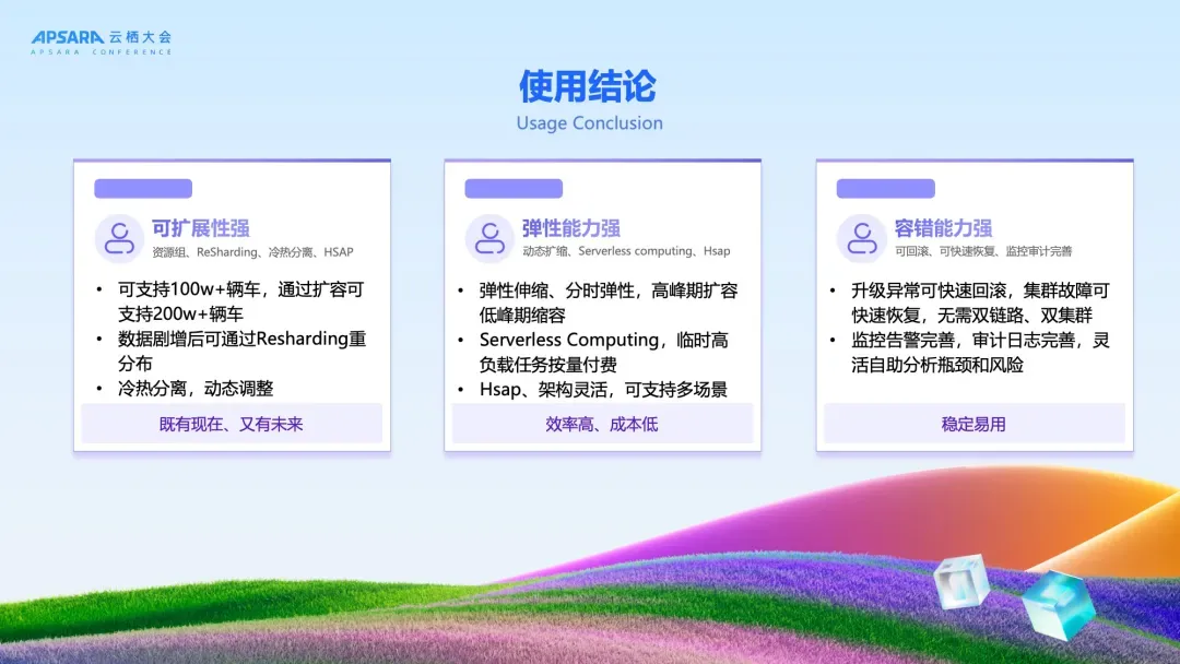 使用了阿里云 Hologres+Flink 这套技术栈以后,我觉得我们既有现在又有未来。如刚才所说,现在能支持理想汽车一百多万辆车的一个场景,也可以通过扩容去支持未来200万辆车甚至更多的一个场景,不需要做多种集群的拆分。第二方面是效率高,成本低。Hologres 具有极致的弹性能力,还有一些这种 Serverless Computing 这样的弹性资源,大幅提高我们的资源利用率,避免资源浪费。而且 Hologres 是一个多模态的分析场景,未来还可以扩展到 OLAP分析、点查服务、全文检索、向量搜索以及AI推理等多种场景。