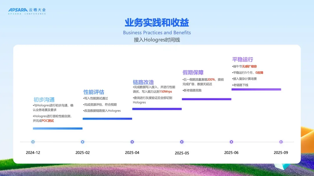 从最开始24年的12月份跟 Hologres 做初步对接,Hologres 团队其实很快的就完成了 POC 的这个测试,符合我们性能的诉求。过完年后我们开始在2-4月份去进行全面的压测跟优化,又做了灰度的查询的验证,验证了扩缩容对业务没有影响。因为这次架构的升级要求对业务无感的,5越分开始我们进行了新老链路的双跑,并在五一和端午两个高峰的假期去验证整体的能力,发现 Hologres 是完全满足假期高峰出行的流量保障要求。端午之后,我们就把老的这个链路给下线了,整个五月期间,也没有发生任何故障,于是我们在实时的链路上又接入了一些复杂的一些计算的场景。