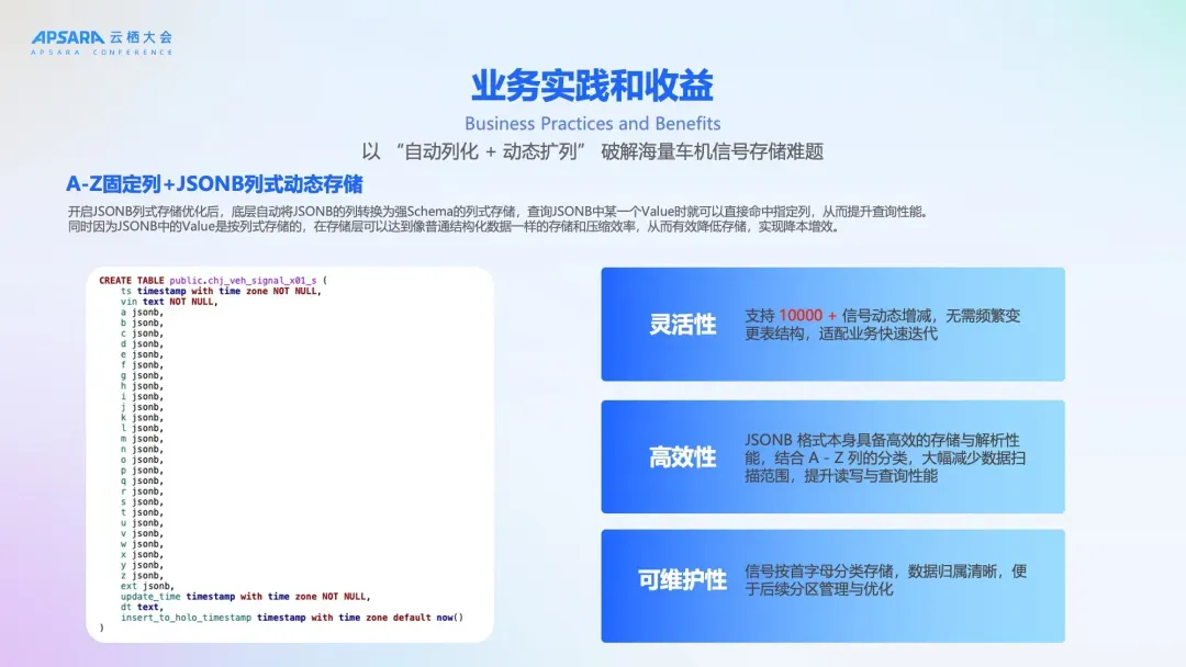 - 高效性:JSONB 格式具备高效存储与解析性能,结合A-Z列分类,大幅减少数据扫描范围;