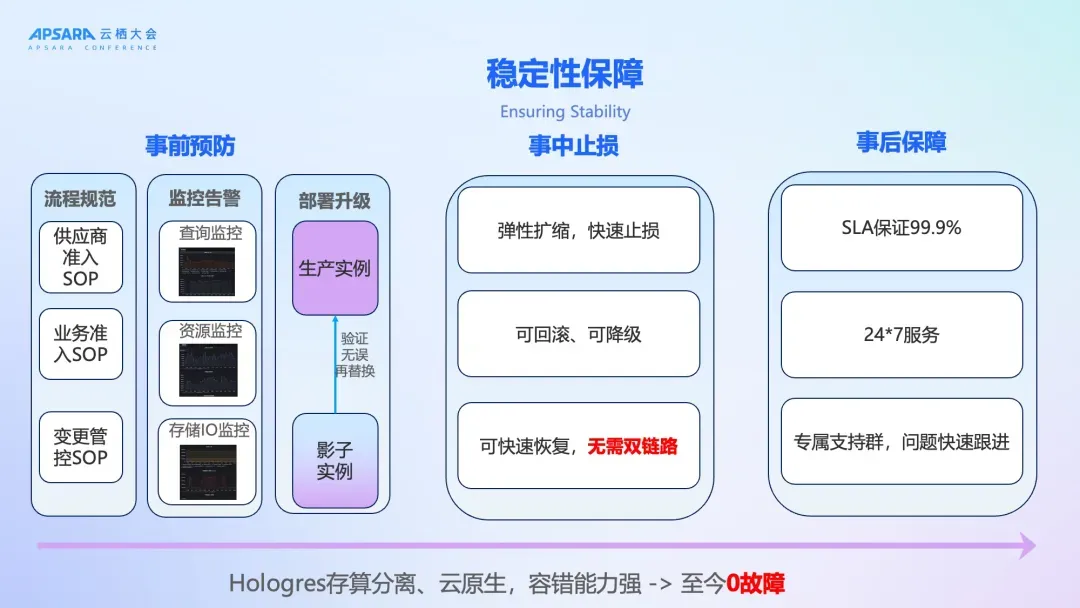 稳定性不仅是产品的能力,更是流程机制的建立。理想汽车基于 Hologres 存算分离、云原生架构,系统容错能力强,上线至今0故障,同时在内部构建了“事前预防、事中止损、事后保障”的全链路稳定性体系: