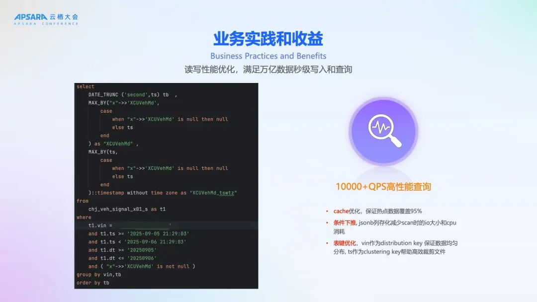 在查询层面,我们是做到了1万+QPS 的秒级返回。主要是基于 Hologres 的 cache 优化能力,保证热点数据能覆盖到95%以上。基于条件下推减少了 scan 的扫描,jsonb 列存化减少 scan 时的 io 大小和 cpu 消耗。然后针对这一些大量的点查,vin 作为 distribution key 保证数据均匀分布, ts 作为 clustering key 帮助高效裁剪文件。