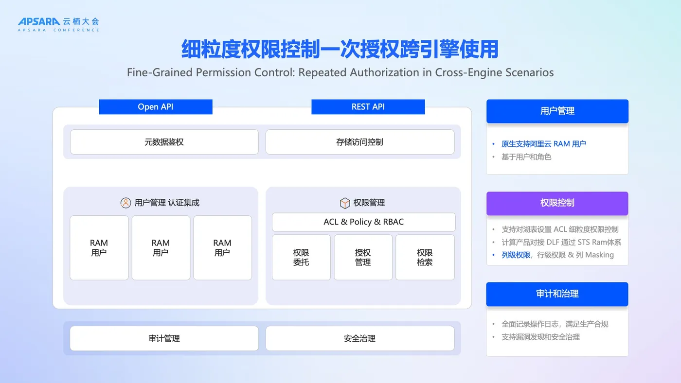 原来自己搭建的Lakehouse平台下,数据权限管理是非常松散,甚至用AKSK这样一套方案是非常有挑战的,DLF提供细粒度的权限管理,可以做到粒级别的数据权限管理,基于table、DataBase、Catalog这些层面都可以做到更好的数据权限管理。基于这套数据权限管理也做了数据的共享,因为有跨团队的协同,所以提供了数据共享的能力来帮助大家更好地做数据协同。