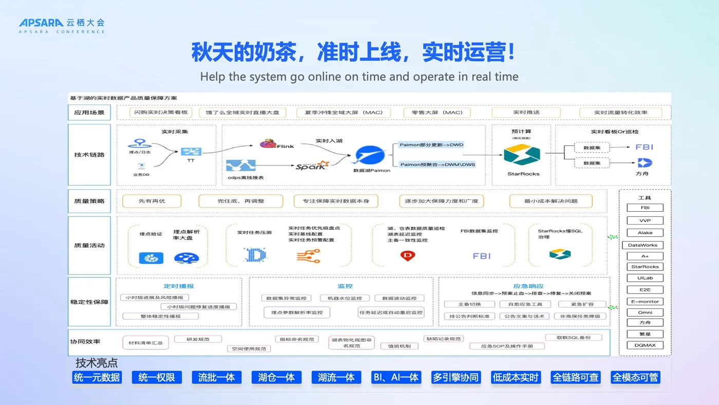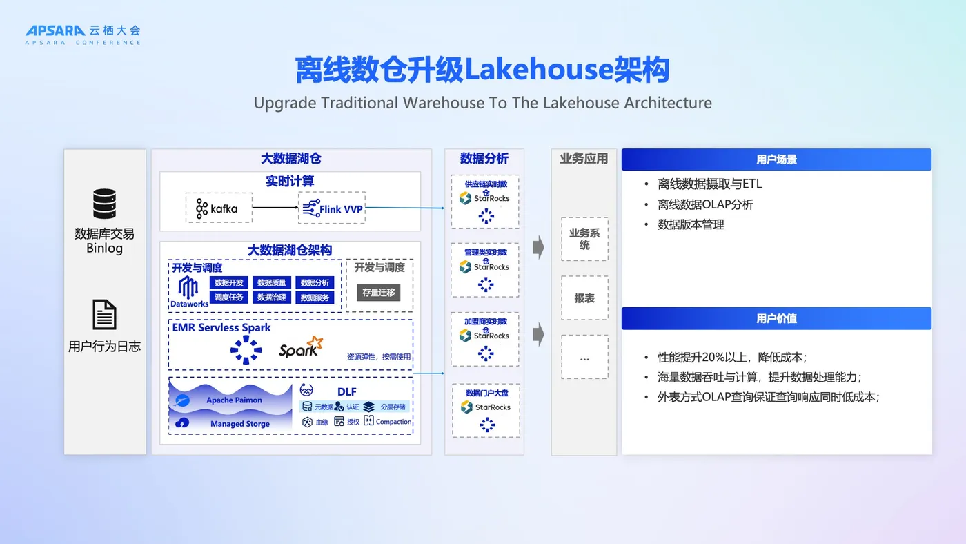 在2025年秋季,阿里云DLF 3.0成功支撑了阿里巴巴集团闪购业务的准时上线。该业务对数据实时性要求极高,需在秒级内完成用户行为分析、库存预警与营销决策。因为在去年阿里巴巴集团就做了Alake项目,基于Lakehouse架构构建了整个平台,所以基于DLF可以让流批做更好地融合。面向用户场景会有BI场景、AI场景,这套架构可以很好地兼容两种场景的使用,灵活选择多种引擎应对业务方的需求。