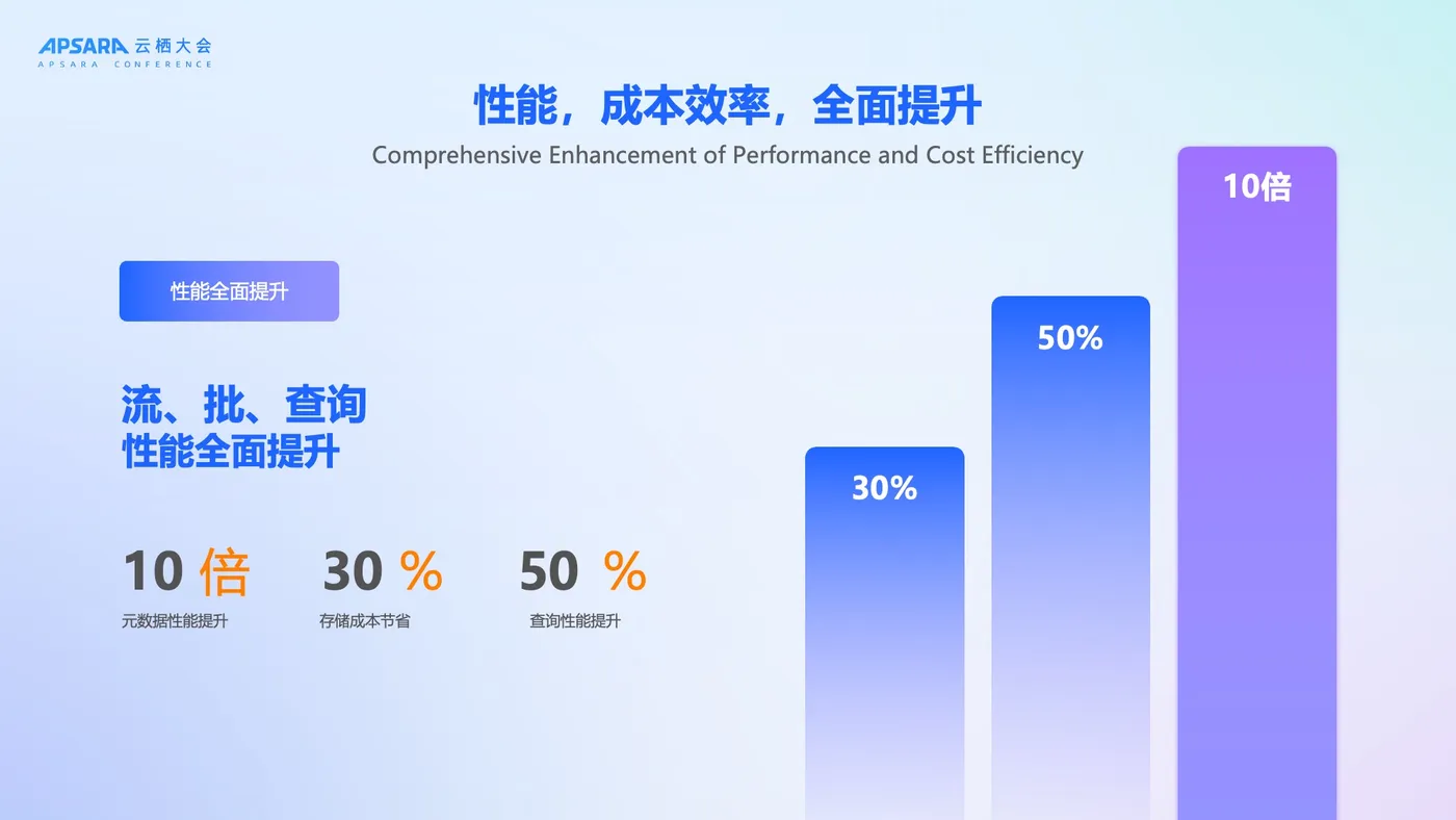 DLF 3.0在性能与成本上实现跨越式提升,元数据访问性能提升10倍以上,存储成本降低30%,查询性能提升50%。我们希望Lakehouse不再是“昂贵玩具”,而是高性价比,具备普适性的数据基础设施。