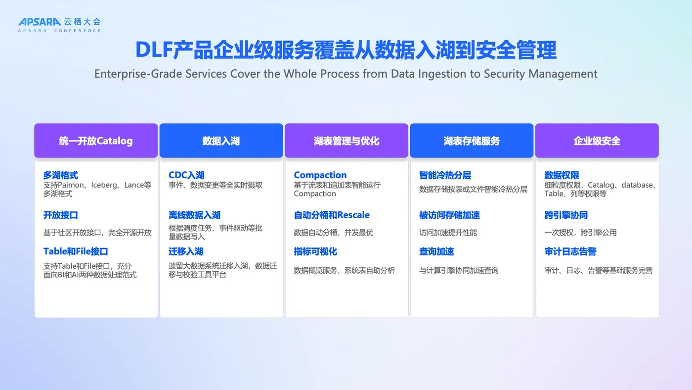 通过一系列重磅升级,DLF产品以统一开放catalog为基础,整体功能覆盖从数据入湖、湖表管与优化、湖表存储服务、企业级安全等丰富功能,让用户离线数据、实时数据、存量系统迁移平滑入湖,同时实现更高效的湖表存、管、优化,真正实现安全开放可靠的湖仓平台。