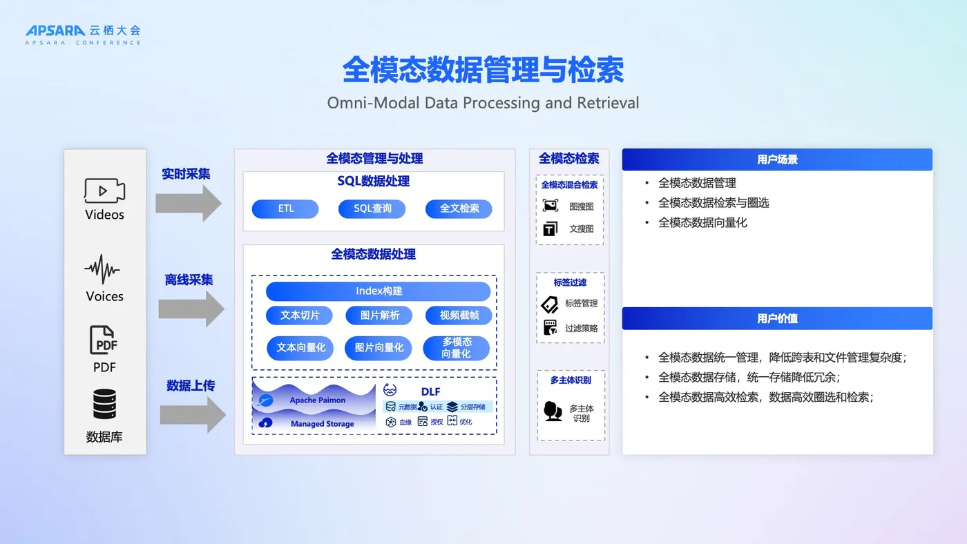 DLF 3.0最引人注目的创新在于全模态数据支持。随着AI时代的到来,大家听到更多的是非结构化数据该怎么管,非常多的视频、图片数据该如何管理,该如何圈选我的DataSet。通过DLF平台可以将非结构化数据,包括视频、音频、PDF进行管理,同时原来这套结构化数据也可以进一步接入。通过实时采集或者离线采集或者数据上传的方式接入到DLF平台,同时通过Lance这样一套底层能力来构建全模态数据的存储、管理以及后续承载embedding数据接入的能力。
