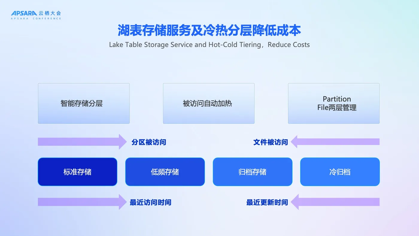 DLF 3.0推出Managed Storage Service,实现存储成本与性能的平衡。DLF基于智能的冷热分层来解决数据合理规划的问题,可以基于读取时间、更新时间的关键事件来决定分区该用什么样的存储介质来承载,同时也可以基于数据的读写行为来对数据做更合理的加速和预热,帮助用户在合理规划存储介质的过程中能够保持数据读写和管理的效率。