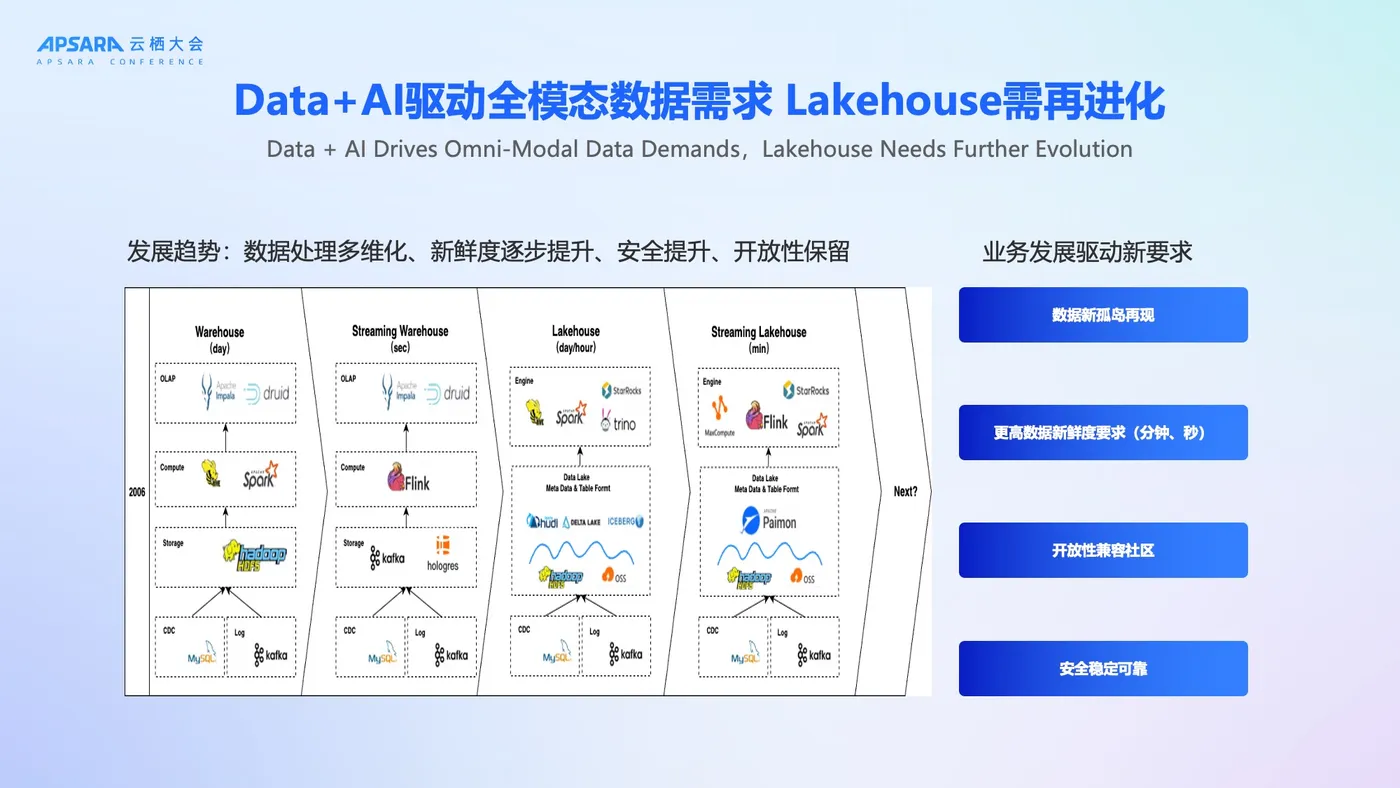 在这样的背景下,Lakehouse架构应运而生,并持续演进。阿里云观察到四大核心趋势正在驱动Lakehouse的下一轮升级: