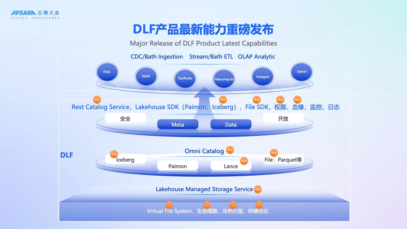 第二个升级对于catalog service的管理,DLF升级到Omni Catalog,我们面向全模态可以提供Iceberg、paimon、lance、object table及file相关的管理,对用户来说有一个非常重要的变化在于原来的Lakehouse架构可能只能管Table,DLF架构下不仅仅可以管理Table数据,还可以管理全模态的数据,意味着tables和files都可以统一管理。paimon是实时湖仓最领先的一套方案,同时我们也兼顾了用户存量的系统架构需求,也可以支持Iceberg这样的湖仓架构,对于用户来说可以做到更灵活和多样的选择。