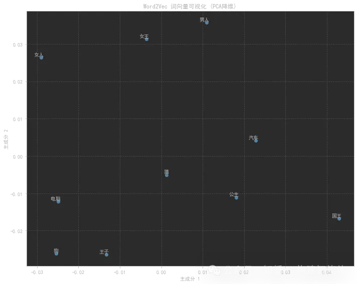 代码会生成一个词向量的二维可视化图,使用PCA将高维词向量降维到二维空间。在这个图中,语义相近的词会在空间中聚集在一起,例如: