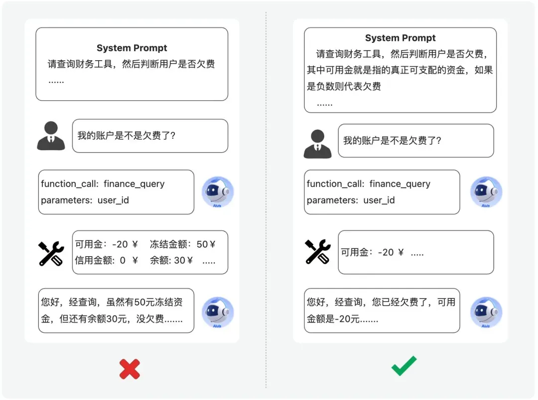 因此,大模型的表现就出现了不稳定的情况,有时候根据余额为负数判定是否欠费,有时候又根据可用金为负数就判定是欠费,有时候又考虑了冻结金额、退款情况等等,导致多次调用大模型输出的判断结论反而是不统一的,这就是严重不符合预期的情况。