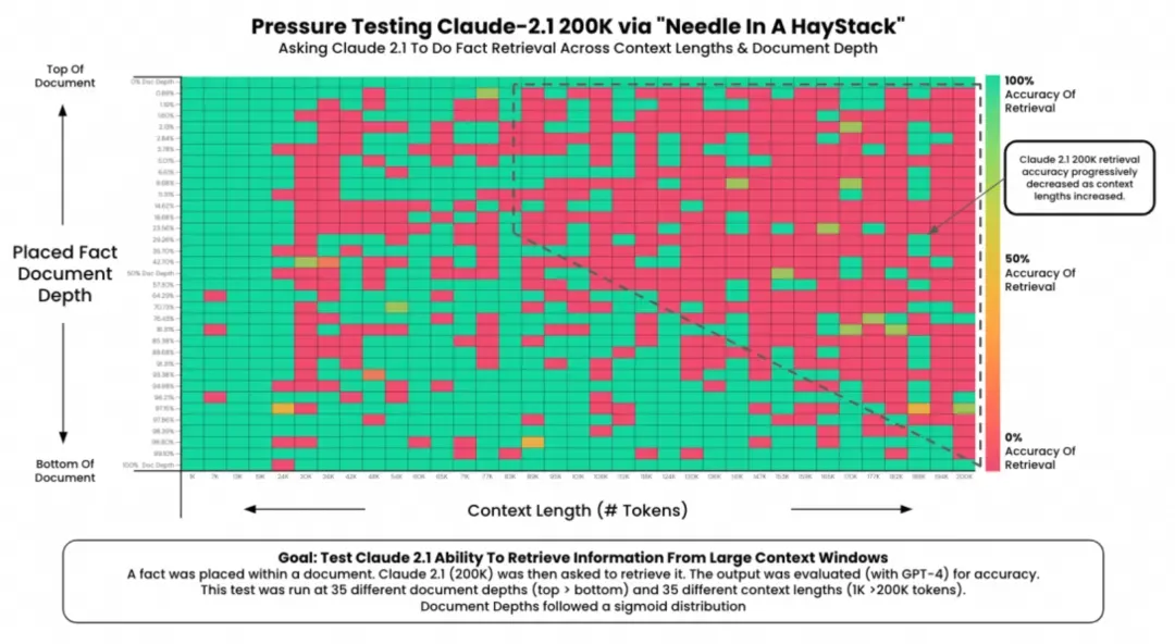 虽然现在的大模型都号称支持百万甚至千万级Token上下文,但实际测试会发现,当上下文长度超过一定长度(例如1万Token以上),模型对历史信息的遗忘率会显著增加,就比如“大海捞针”(Needle In A Haystack)这类benchmark的准确率上看,token数量越多,超过某个阈值之后就开始急速下滑。甚至一些你写在前面的系统指令里的核心要求,都很可能会被模型间歇性遗忘,造成Agent行为的极度不稳定。如下图中对Claude 2.1版本的评测(虽然评测时间有点早了,但是结论基本还适用)。