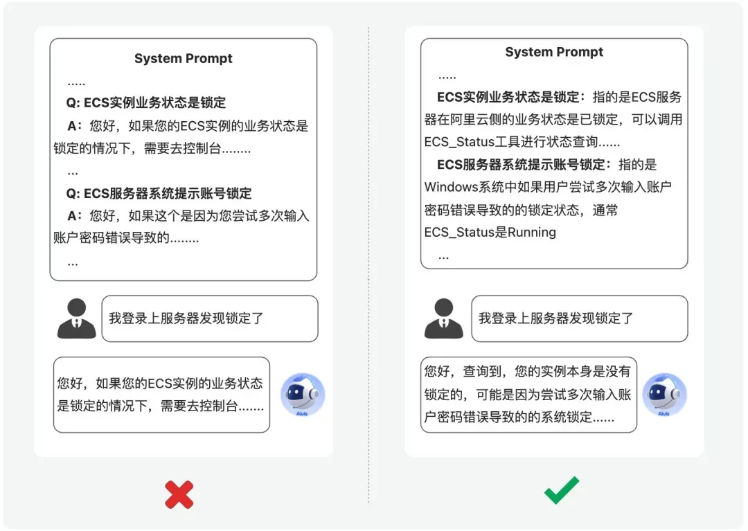 虽然我们在系统指令里对这两种情况做了区分,但当客户模糊地问“我的服务器锁定了怎么办?”时,模型大概率会搞混,并且非常倾向于回复业务锁定的解决方案,而实际上客户经常高频遇到的往往是系统锁定。但是,实际分析的时候,你会发现大模型理解成业务锁定也是非常正常的, 因为客户没有明确说是系统锁定,只是说ECS锁定了,因为我们的提示词里要求模型按照阿里云的视角来进行回复,模型大概率就会理解成“实例本身锁定”。