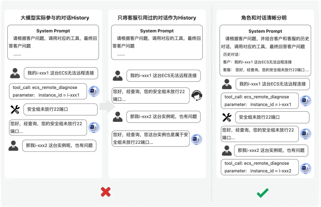 比如,某个客户说他的一台实例远程无法连接,大模型开始会正常调用工具去进行诊断,然后反馈结论是安全组的问题,接着客户又说他的另一台实例也无法远程连接,这时候由于我们直接将小二与客户的对话直接作为History喂给大模型,希望让大模型基于这个对话History继续往下续写,结果是模型收到这个History的影响,并没有直接调用工具,而是自己幻觉编造了一个结果,没有做任何查询就直接说也是安全组未放行的问题,这就导致了严重的事实性错误。