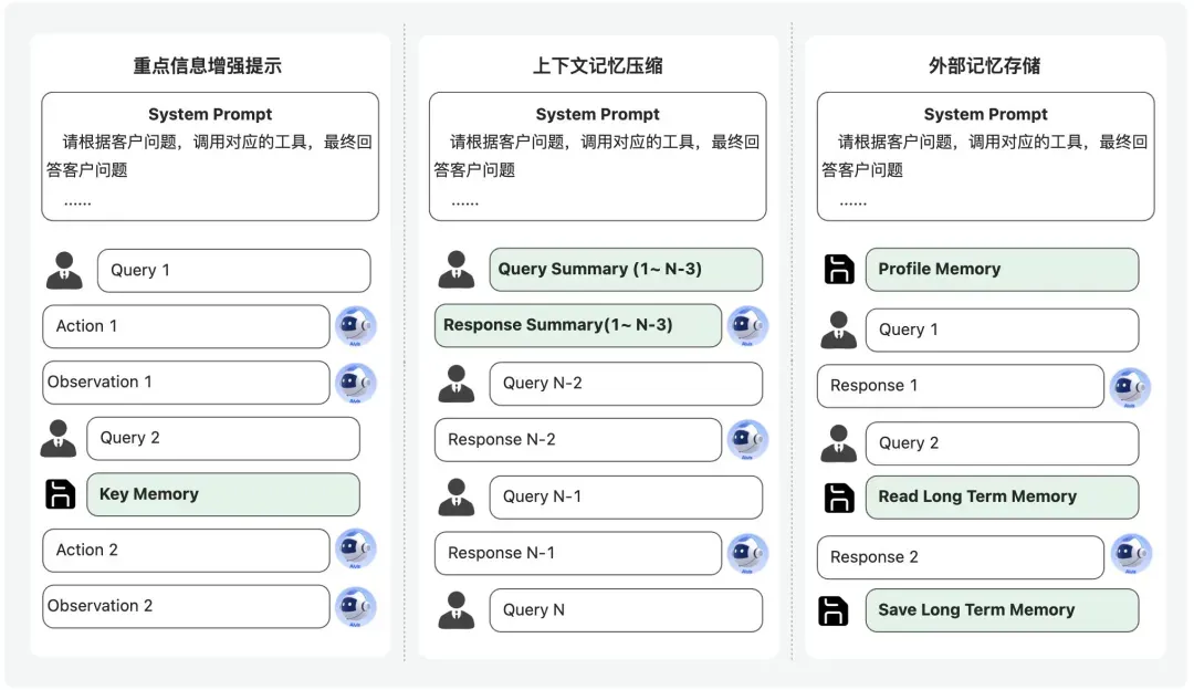 核心原则:重点信息多次增强提示,上下文压缩减少历史对话轮次,外部存储帮助实时唤起更久的记忆。
