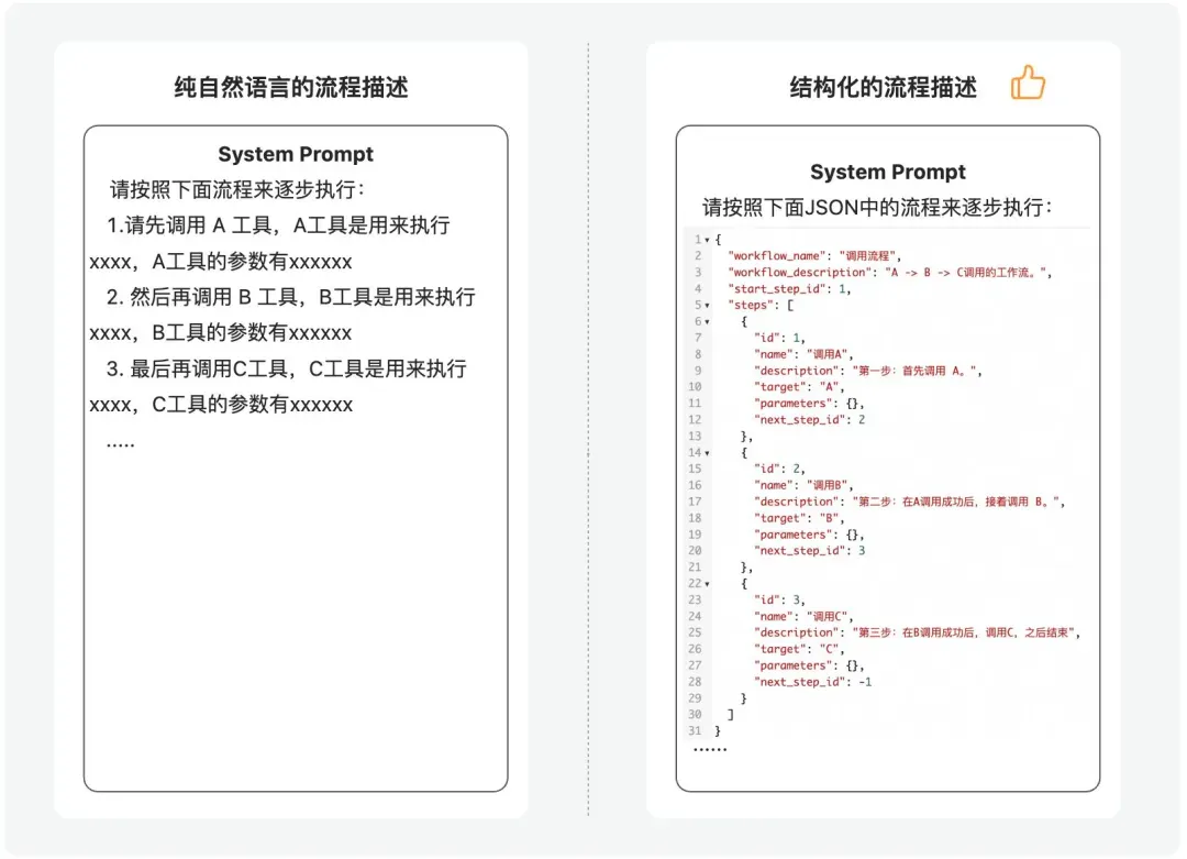 例如,“先调 A,再调 B,再调 C”这个流程,有时候用自然语言描述,让调用过程参数比较复杂的时候,模型未必能很好的遵循,有时候就会跳过B直接调用C了,但如果将其表达为类似下面的形式,模型的遵循能力会好很多,当然这个例子举的还是比较简单,一些复杂的逻辑通过自然语言描述就比较复杂了,但是通过结构化的形式就会清晰很多。