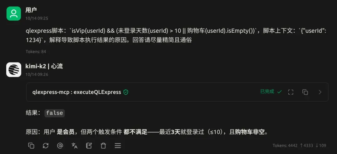 利用中间运算结果,大模型可以更好地对表达式进行调试和诊断。我们提供了 qlexpress-mcp [3]的示例,让大模型结合 mcp,可以帮助业务人员更好地对规则运行结果进行分析。比如下面的优惠券规则未命中的原因分析:用户近三天有过登录,且购物车非空,导致未命中规则。