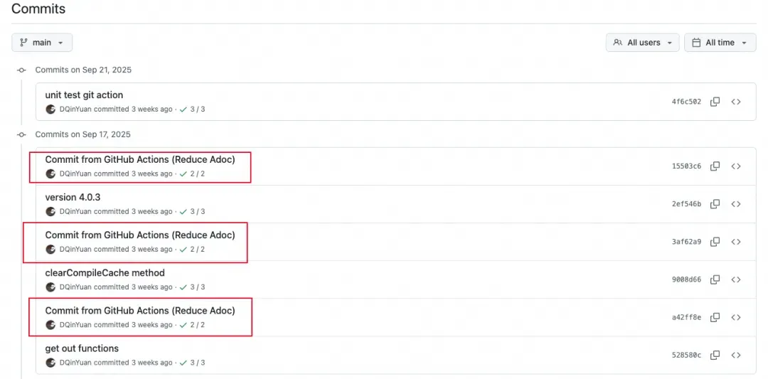 添加这个配置后,你会发现很多额外的 Commit,就是 Git Action 在预处理 README-source.adoc 后,对 README.adoc 发起的提交: