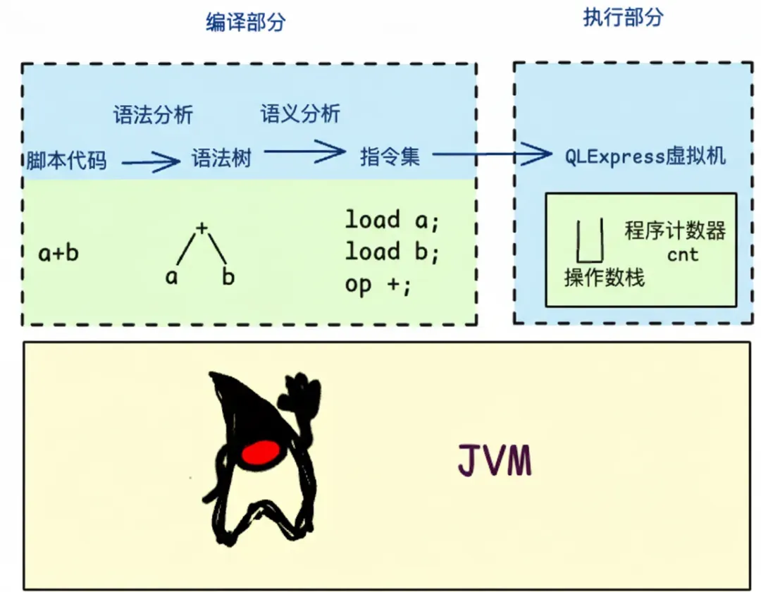 QLExpress 脚本的执行链路由编译和执行两部分组成。用户输入一段脚本文本后,会先通过语法分析将脚本解析成自定义的指令集,之后通过虚拟机执行指令集,得到执行结果。可以通过缓存指令集,跳过编译部分,提升脚本的执行效率。