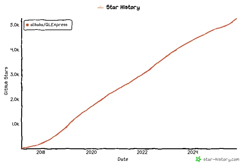 和很多项目的 star 数爆发式增长不同,QLExpress 一直是靠着用户的口碑传播稳步增长,最近一年随着 QLExpress4 的更新才稍有加速。