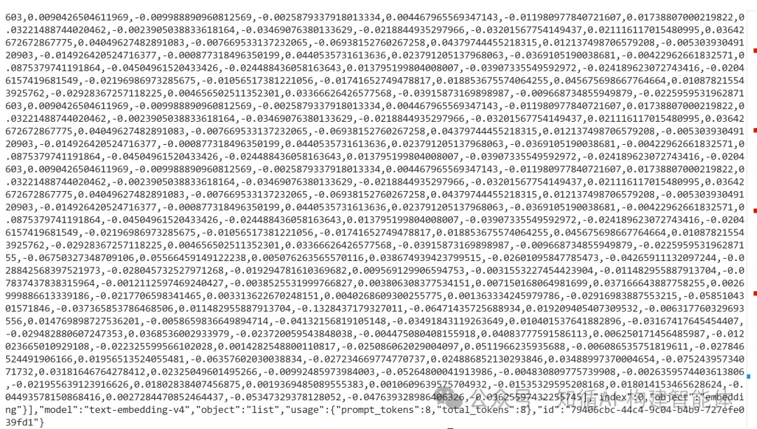 {"data":[{"embedding":[0.0026341788470745087,-0.03762197867035866,-0.024403059855103493,-0.010764381848275661,0.01541021279990673,0.0007359159062616527,0.018554862588644028,-0.02278093248605728,-0.05350175499916077,0.023905038833618164,-0.02632400020956993,-0.009014192037284374,0.001929833902977407,0.0883917286992073,0.003021924290806055,0.015310607850551605,0.05139583349227905,-0.04928991198539734,-0.053074877709150314, 中间省略部分.... -0.004830809775739908,-0.0026359574403613806,-0.021955639123916626,0.01802838407456875,0.0019369485089555383,0.0010609639575704932,-0.01535329595208168,0.018014153465628624,-0.04493578150868416,0.0027284470852464437,-0.05347329378128052,-0.047639328986406326,-0.03625597432255745],"index":0,"object":"embedding"}],"model":"text-embedding-v4","object":"list","usage":{"prompt_tokens":8,"total_tokens":8},"id":"4f3c37d0-1b7b-99bb-ba7d-878b0e73a153"}