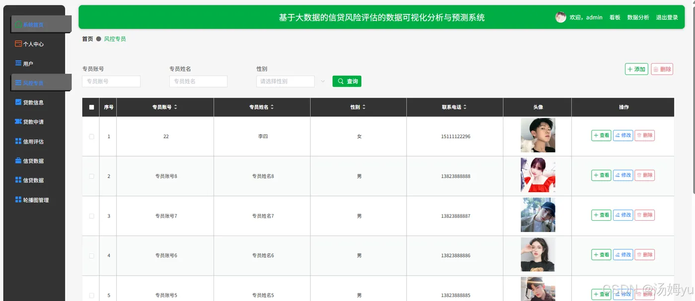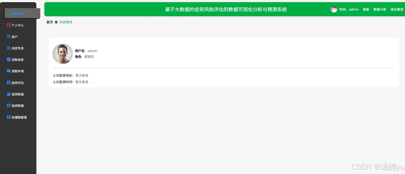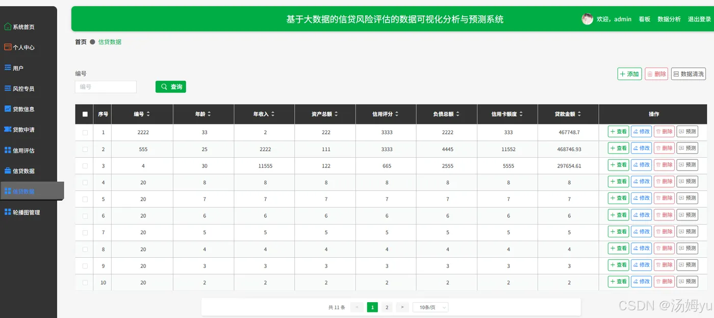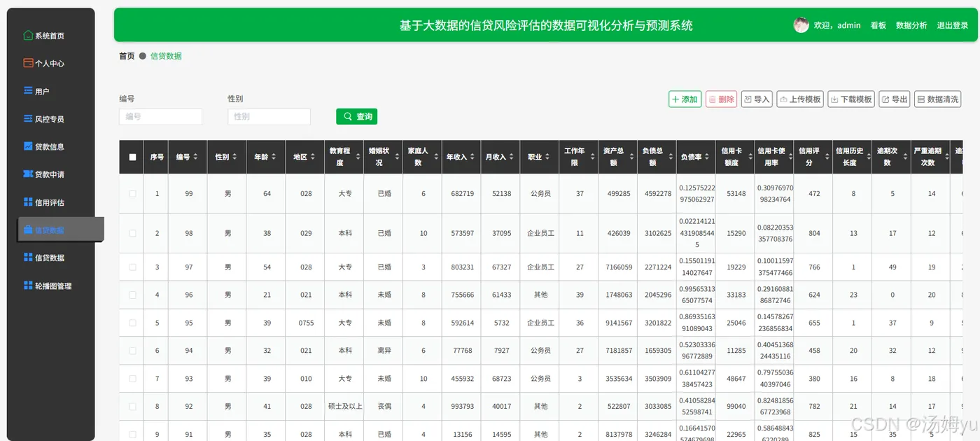该系统能够有效提升信贷风险评估的效率与准确性。通过数据可视化技术,风险管理人员可以快速浏览和分析海量的信贷数据,及时发现异常数据和潜在风险点,从而提前采取风险控制措施,降低不良贷款率,减少金融机构的损失。该系统能够为信贷审批提供科学依据,帮助审批人员更全面地了解借款人的信用状况,做出更合理的贷款决策,提高金融机构的信贷业务质量。该系统的应用有助于提升整个金融市场的稳定性。准确的信贷风险评估能够促使金融机构更加谨慎地开展信贷业务,避免过度放贷和盲目投资,减少系统性风险的发生概率。该系统还可以促进金融市场的公平竞争,通过科学的风险评估,金融机构能够为不同信用等级的客户提供更加合理的贷款利率和额度,提高金融资源的配置效率。该系统的研究与开发推动了大数据、人工智能、数据可视化等前沿技术在金融领域的应用与创新。通过对信贷数据的深度挖掘与分析,可以不断完善风险评估模型,提升模型的预测精度,为金融科技创新提供有益的实践经验。该系统也为相关领域的研究人员提供了一个良好的研究平台,促进学术界与金融行业的深度融合,推动金融风险管理理论与实践的共同发展。