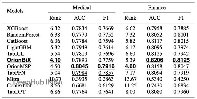 医疗和金融数据集的性能。Rank是域内mean rank(越低越好)。ACC和F1都是0-1范围,越高越好。