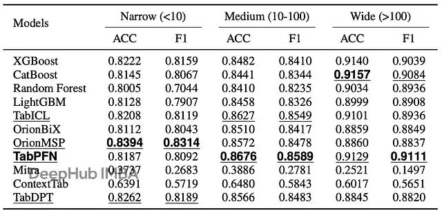 按特征维度(数据集宽度)的性能变化。ACC是准确率,F1是加权F1分数,范围0-1越高越好。模型按adaptation策略分组。每组内第一名第二名有格式标记。