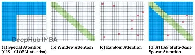 注意力机制的构成。白色表示没有attention。(a)特殊attention,包括CLS=4和global attention GB=4;(b)滑动窗口attention,w=8;(c)随机attention,r=2;(d)Orion-MSP的组合行表示。