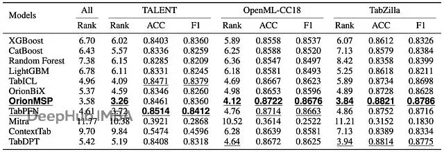 作者在三个主要benchmark上测试了Orion-MSP:TALENT、OpenML-CC18、TabZilla,几百个不同的数据集,对手包括XGBoost、CatBoost这些传统方法,还有TabPFN、TabICL、TabDPT这些新的foundation models。