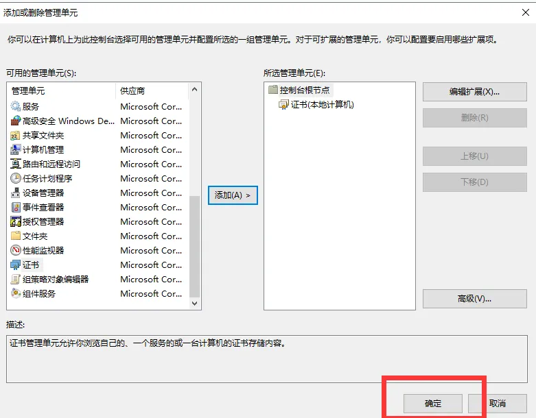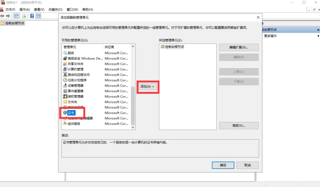 在弹出的穿梭框中,将 “证书” 管理单元从 “可用的管理单元” 添加到 “所选管理单元”