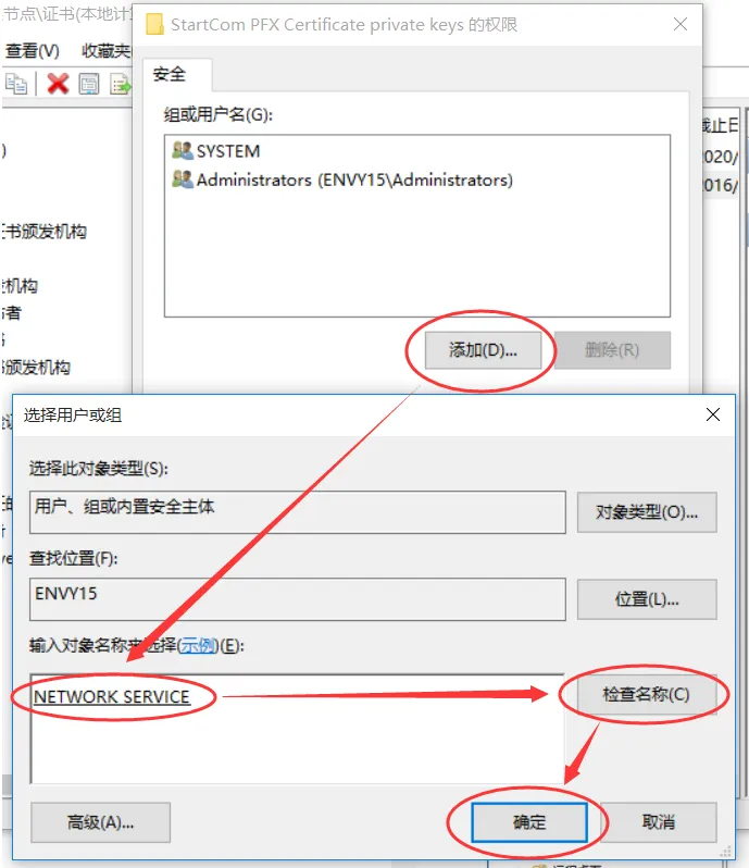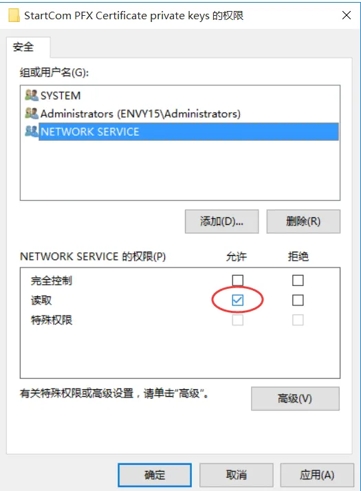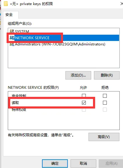 检查用户 “NETWORK SERRVICE” 是否有读取权限