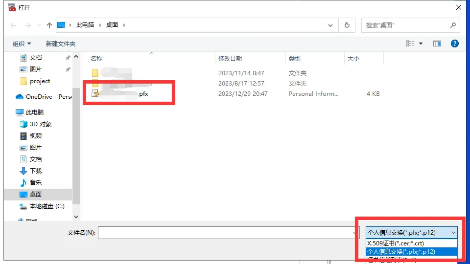 在选择文件的窗口中,将右下角的文件类型切换为 个人信息交换 ,然后选择打开需要导入的证书文件