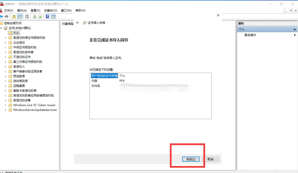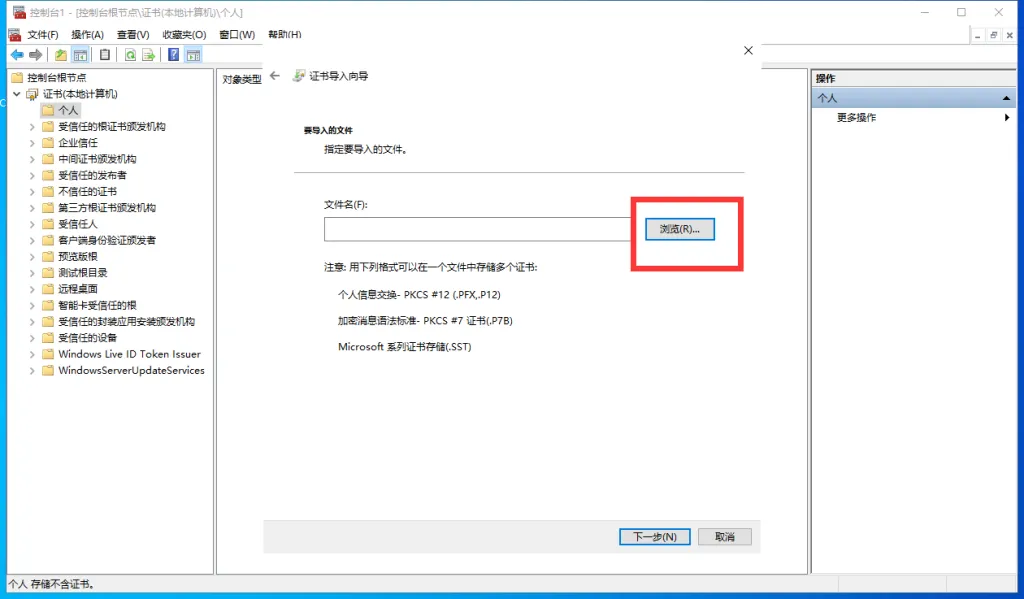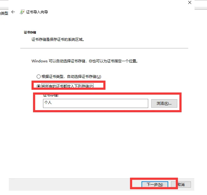 在证书导入向导中,将证书的存储位置设置为个人,如图所示