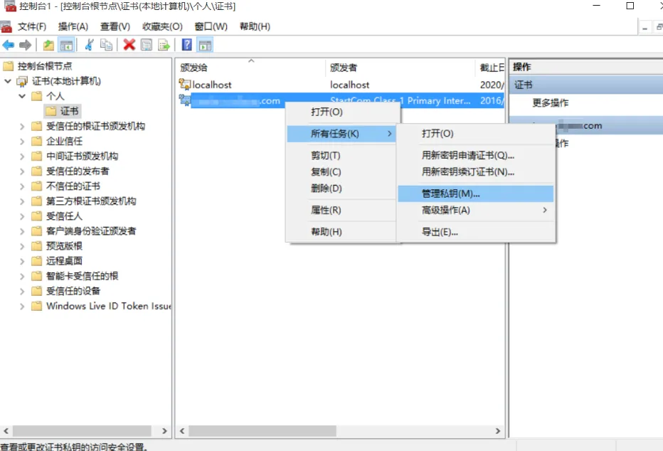 右键刚刚导入的证书,在弹出的上下文菜单中依次选择 “所有任务” — “管理私钥”