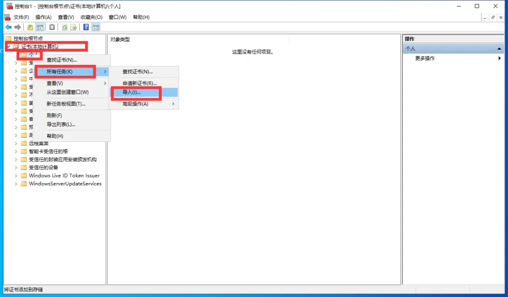 添加完成后,依次展开 “证书” — “个人” ,随后右键 个人 或右侧空白位置,在打开的上下文菜单(即右键菜单)中依次选择 “所有任务” — “导入”