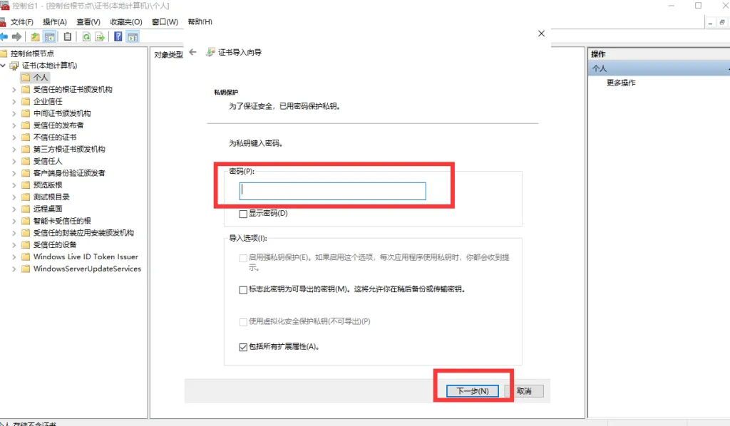 打开后,在证书导入向导中键入导出时设置的密码,随后点击下一步