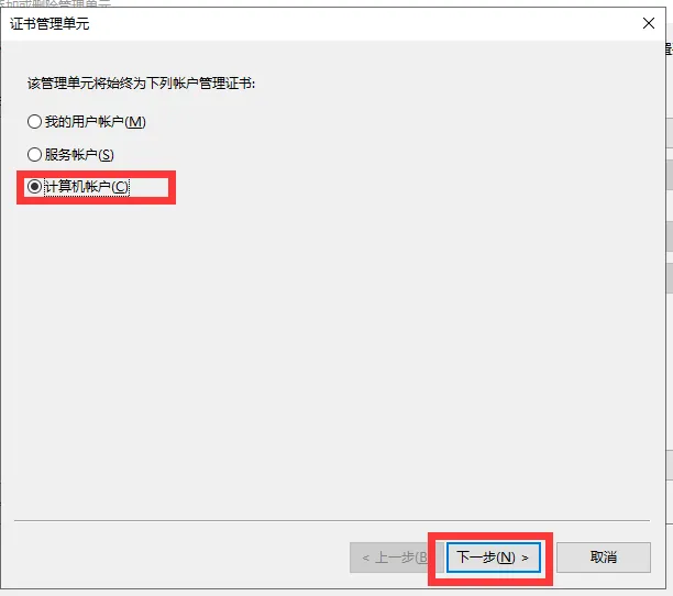 按照实际情况配置控制台,本文将配置 该管理单元始终为下列账户管理证书 为 计算机账户