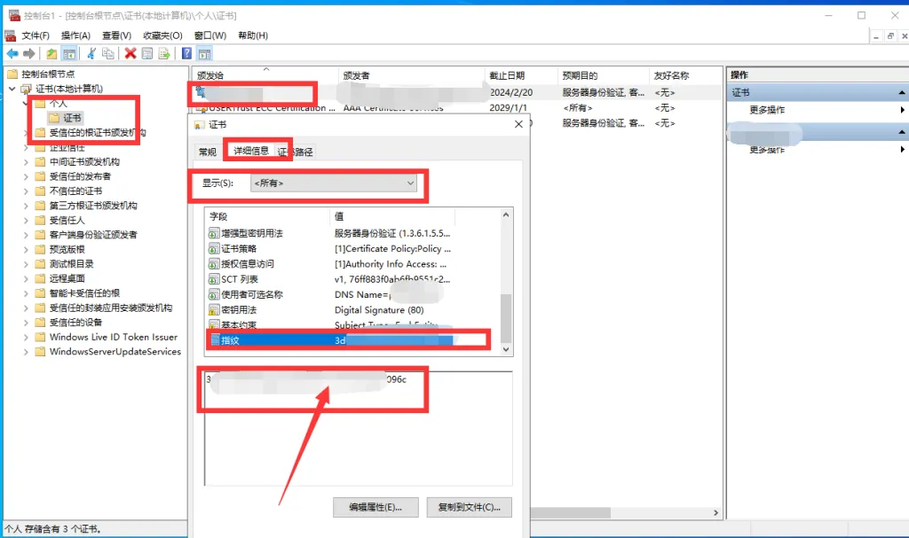 查看证书的信息,在 “详细信息” 选项卡中选择指纹既可查看,如下图箭头的位置