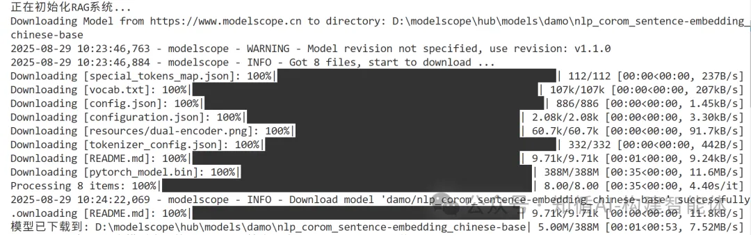 下面我们实现一个基于RAG的问答系统,结合前期的知识点,使用了阿里千问模型(qwen-max)作为生成模型,使用ModelScope的嵌入模型(damo/nlp_corom_sentence-embedding_chinese-base)来生成文本的向量表示,处理文本向量化,并使用FAISS作为向量数据库进行高效相似性检索,从而实现完整的RAG流程:文档处理→向量化→检索→增强提示→生成回答;