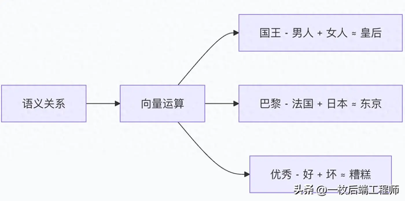 语义相近 → 向量距离近 语义相反 → 向量方向相反 语义关系 → 向量运算可表达
