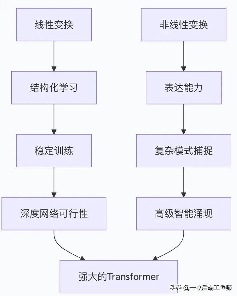 这种线性与非线性的交替舞蹈,让Transformer既保持了数学的优雅,又获得了现实的复杂性理解能力,最终成就了现代人工智能的辉煌成就。