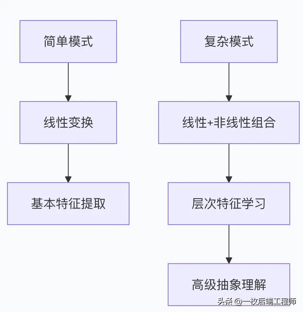 # Transformer中的层次化特征学习过程 def hierarchical_feature_learning(input_vectors): # 第一层:基础特征 layer1 = linear1(input_vectors) # 线性组合 layer1 = gelu(layer1) # 非线性变换 # 第二层:组合特征 layer2 = linear2(layer1) # 线性组合基础特征 layer2 = gelu(layer2) # 非线性创建高级特征 # 第三层:抽象特征 layer3 = linear3(layer2) # 线性组合高级特征 layer3 = gelu(layer3) # 非线性创建抽象概念 return layer3