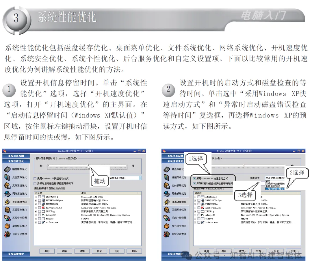提取的文本长度: 7494 个字符。 文本被分割成 10 个块。 已从文本块创建知识库。 页码映射完成,共 10 个文本块 向量数据库已保存到: ./vector_db 页码信息已保存到: ./vector_db\page_info.pkl 系统性能优化可以通过多种方式进行,以下是具体的方法和步骤: ### 1. **磁盘缓存优化** - 调整系统对磁盘数据的缓存策略,以提高读写效率。 ### 2. **桌面菜单优化** - 减少桌面图标和菜单项的加载时间,提高桌面响应速度。 ### 3. **文件系统优化** - 定期进行磁盘碎片整理,确保文件存储连续,减少磁盘寻道时间。 ### 4. **网络系统优化** - 调整网络协议和设置,优化网络连接速度和稳定性。 ### 5. **开机速度优化** - **设置开机信息停留时间**:通过拖动滑块调整开机信息显示的时间。 - **采用快速启动方式**:选中“采用Windows XP快速启动方式”复选框。 - **关闭不必要的开机自启动程序**:在“请选择开机不自动运行的项目”列表中取消选中不需要的程序。 ### 6. **系统安全优化** - 关闭不必要的后台服务和防火墙规则,减少系统资源占用。 ### 7. **系统个性优化** - 根据用户需求调整系统界面和功能设置。 ### 8. **后台服务优化** - 停用或调整不常用的后台服务,以释放系统资源。 ### 9. **使用系统工具** - 利用**Windows优化大师**等工具,对系统进行全面优化,包括垃圾文件清理、冗余DLL分析等。 ### 操作步骤示例: 1. **单击“系统性能优化”选项**,选择“开机速度优化”。 2. **调整启动信息停留时间**:拖动滑块设置开机信息停留时间。 3. **设置启动方式**:勾选“采用Windows XP快速启动方式”和“异常时启动磁盘错误检查等待时间”。 4. **选择不开机自启动的项目**:在列表框中取消选中不需要开机自启动的程序。 5. **单击“优化”按钮**完成设置。 通过这些方法,可以显著提高系统的运行效率和响应速度。 来源: 文本块页码: 13 文本块页码: 10 文本块页码: 9 文本块页码: 7 文本块页码: 1 文本块页码: 18 文本块页码: 4 文本块页码: 16 文本块页码: 2