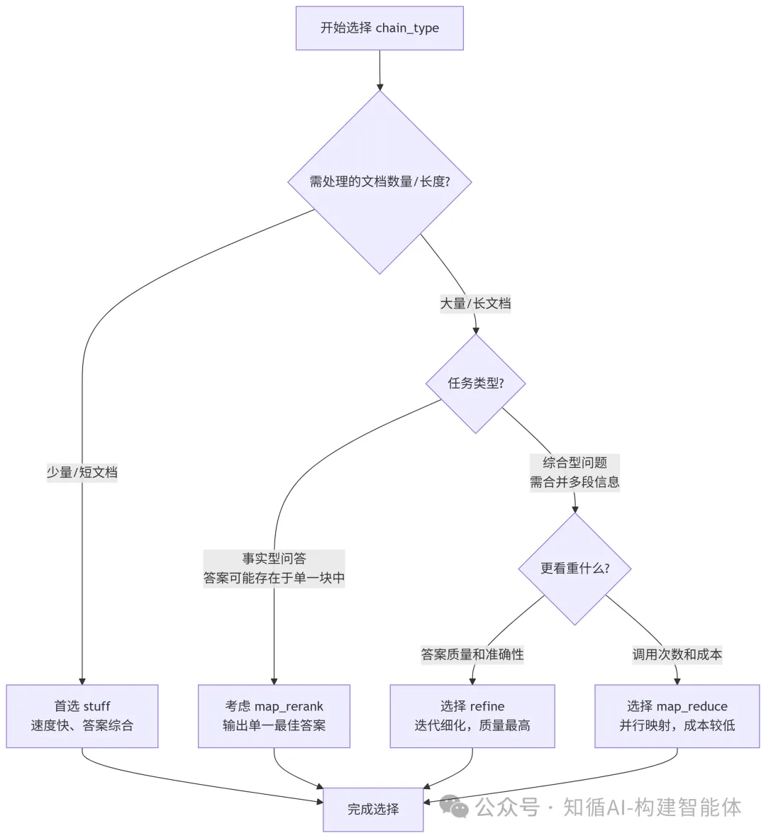 - 如果文档太多太长 → 选择 map_reduce 或 refine。
