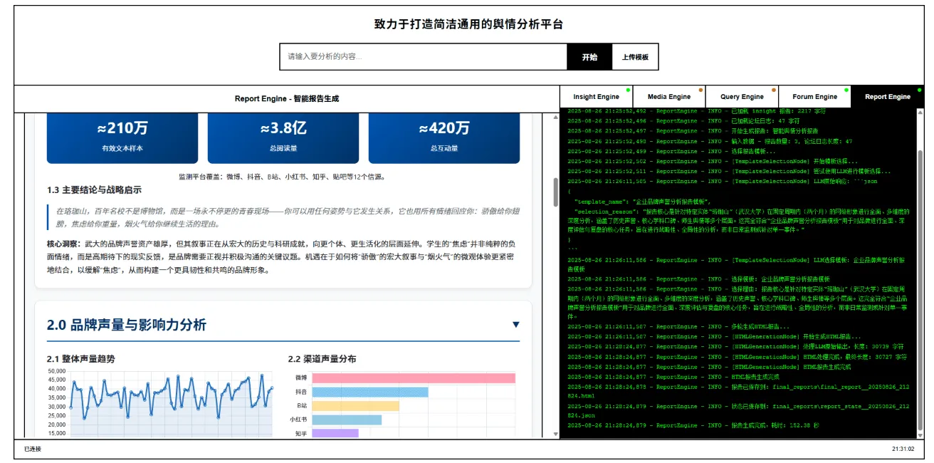 | 多智能体分析引擎 | 系统内置 Query Agent、Media Agent、Insight Agent、Report Agent 等多个 Agent 协同工作,多模型融合,不仅仅是普通 LLM 推理。 |