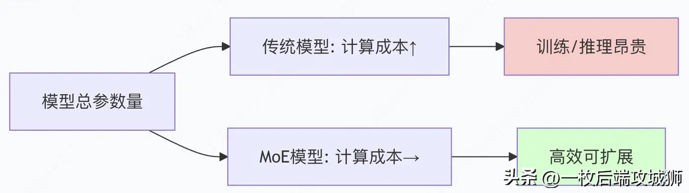 传统模型计算量: O(N) # N为参数量 MoE模型计算量: O(N/k × k) = O(N) # 但常数项更小 实际效果: 总参数↑,激活参数→